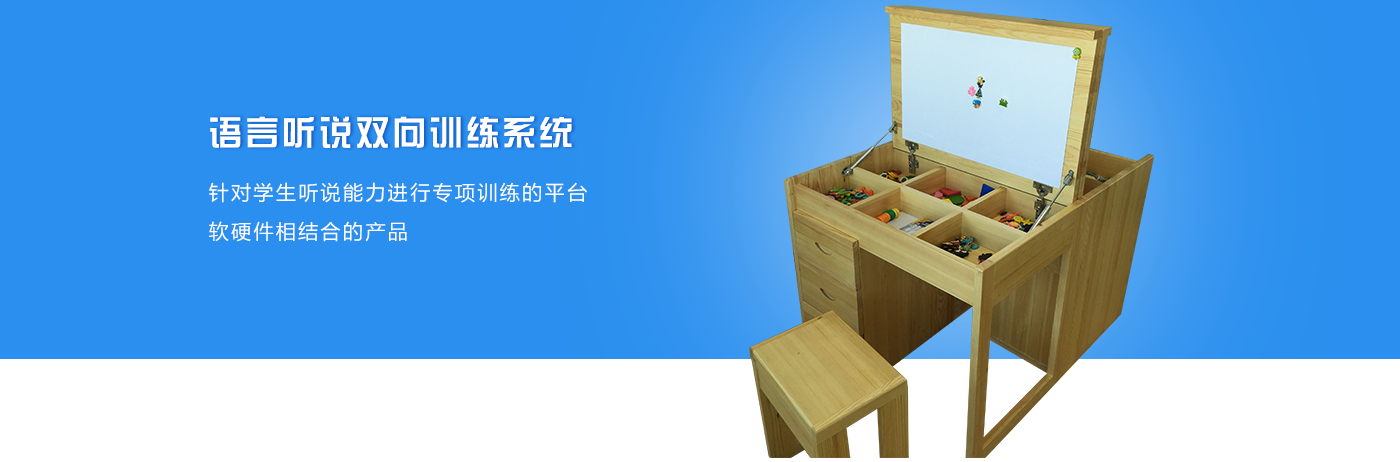 长800mm,宽700mm,中间位置为双面挡板,挡板高400mm,形成双面工作台。老师和训练者相对而坐。通过低、中、高三种难度工作组件进行听说双向训练,具备平板电脑中语言听说双向训练功能。