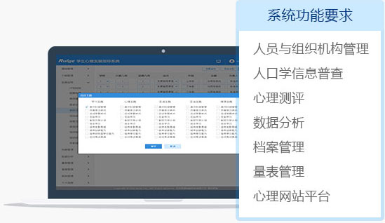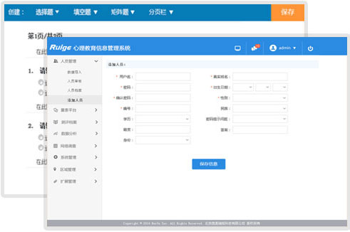 心理教育信息化管理系统为被试提供心理健康、人格特点、职业兴趣、学习适应、智力推理能力等方面开展专业测评,建立被试心理档案,并实现心理咨询师对测评人员心理特点的研究分析。